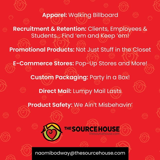 Branded Merchandise is a vital part of your marketing mix, and The Source House can help you source and imprint the perfect items to enhance your brand! From apparel to e-commerce stores, recruitment & retention, drinkware, writing instruments, products of all kinds, “lumpy” direct mail, custom packaging, safety programs and so much more! Our experience and expertise helps you select, source and imprint the perfect products for your message.